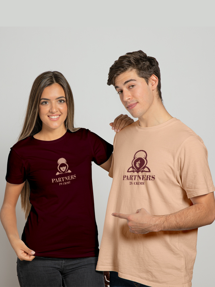 Crafted for comfort and everyday wear, these regular-fit t-shirts offer a soft feel, breathable fabric, and a modern look that suits any casual outfit. The bold “Partners in Crime” print adds a playful touch, making them ideal for couples who love expressing their bond in a fun way.